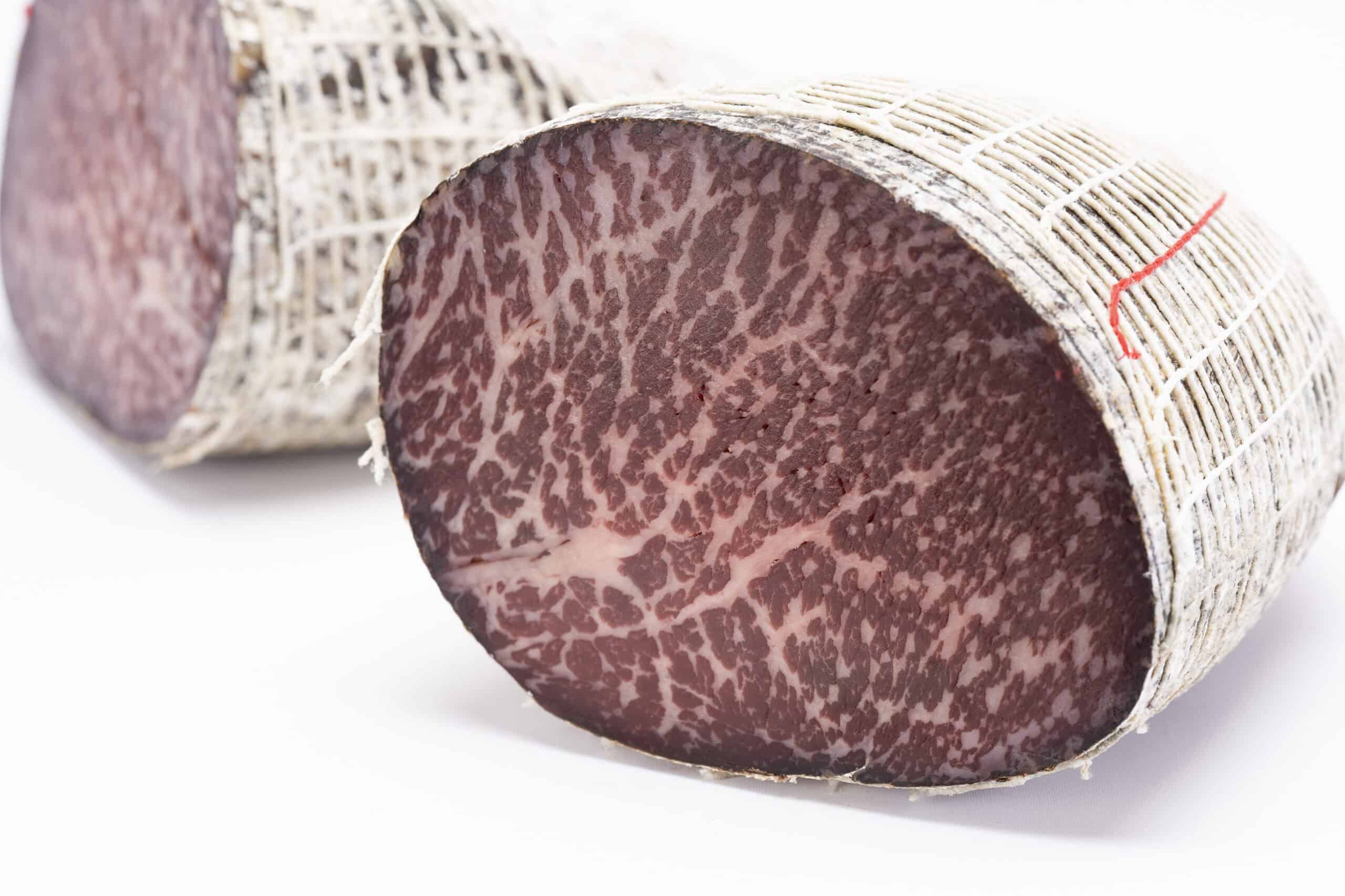 Wagyu Bresaola has a much richer taste and texture than the Bresaola.It is air-dried, salted beef that has been aged for 2 to 3 months until it becomes hard and turns a dark red, almost purple in colour. It is made from top (inside) round, and is lean and tender, with a sweet, musty smell.