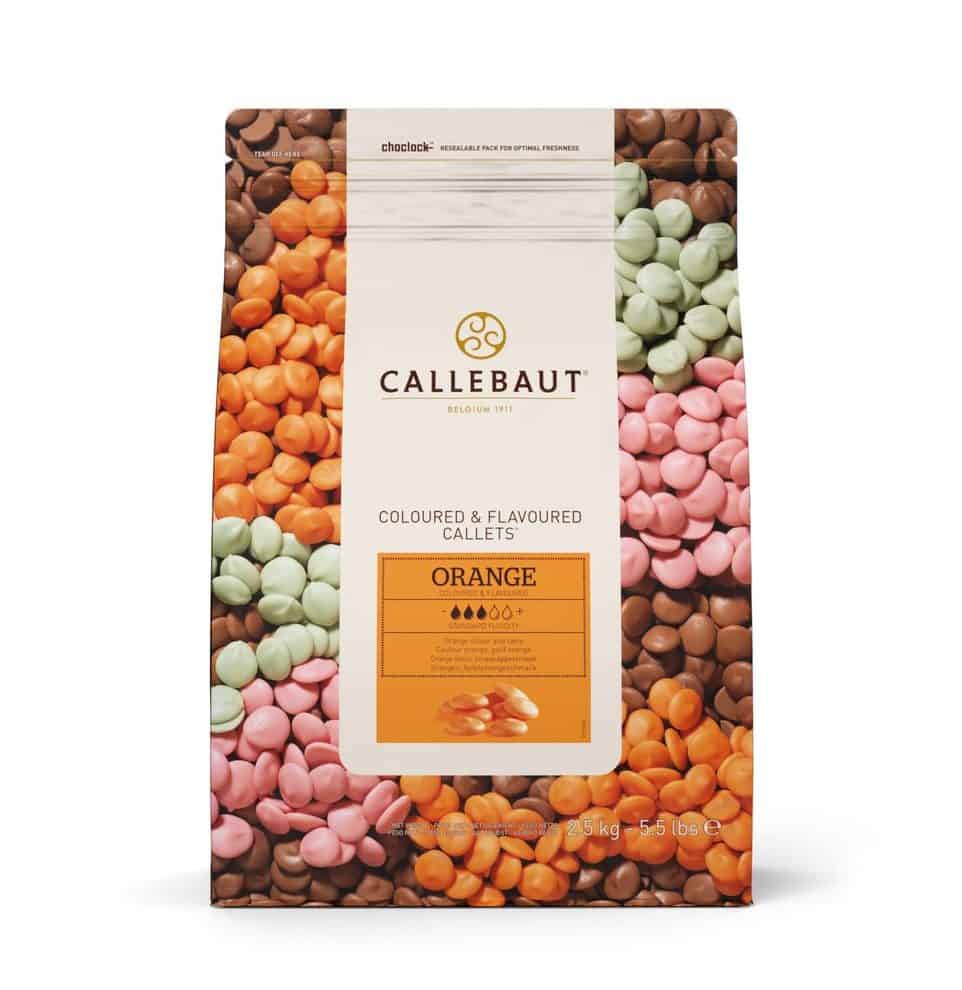 Orange taste and orange colour. Here’s a great chocolate to sign off your creations with a surprising dash of colour and flavour. Orange Callets, made with Callebaut Belgian white chocolate, combine a creamy and caramelly sweet taste with the bittersweet taste of oranges.