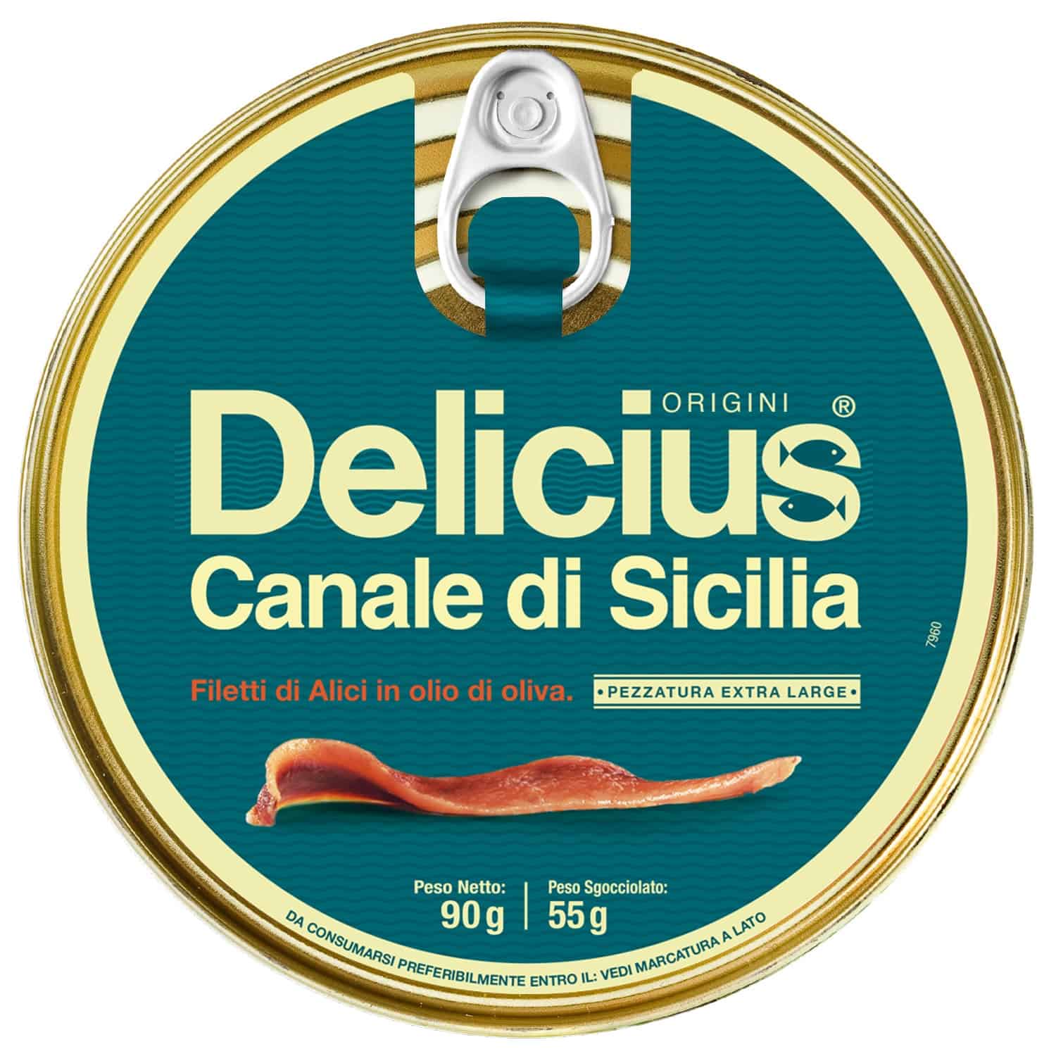 Sicilian Strait anchovies fillets in olive oil, 90g. The anchovies captured in this stretch of sea have a delicate consistency and can be recognized by their intense pink color and the typical and persistent smell.