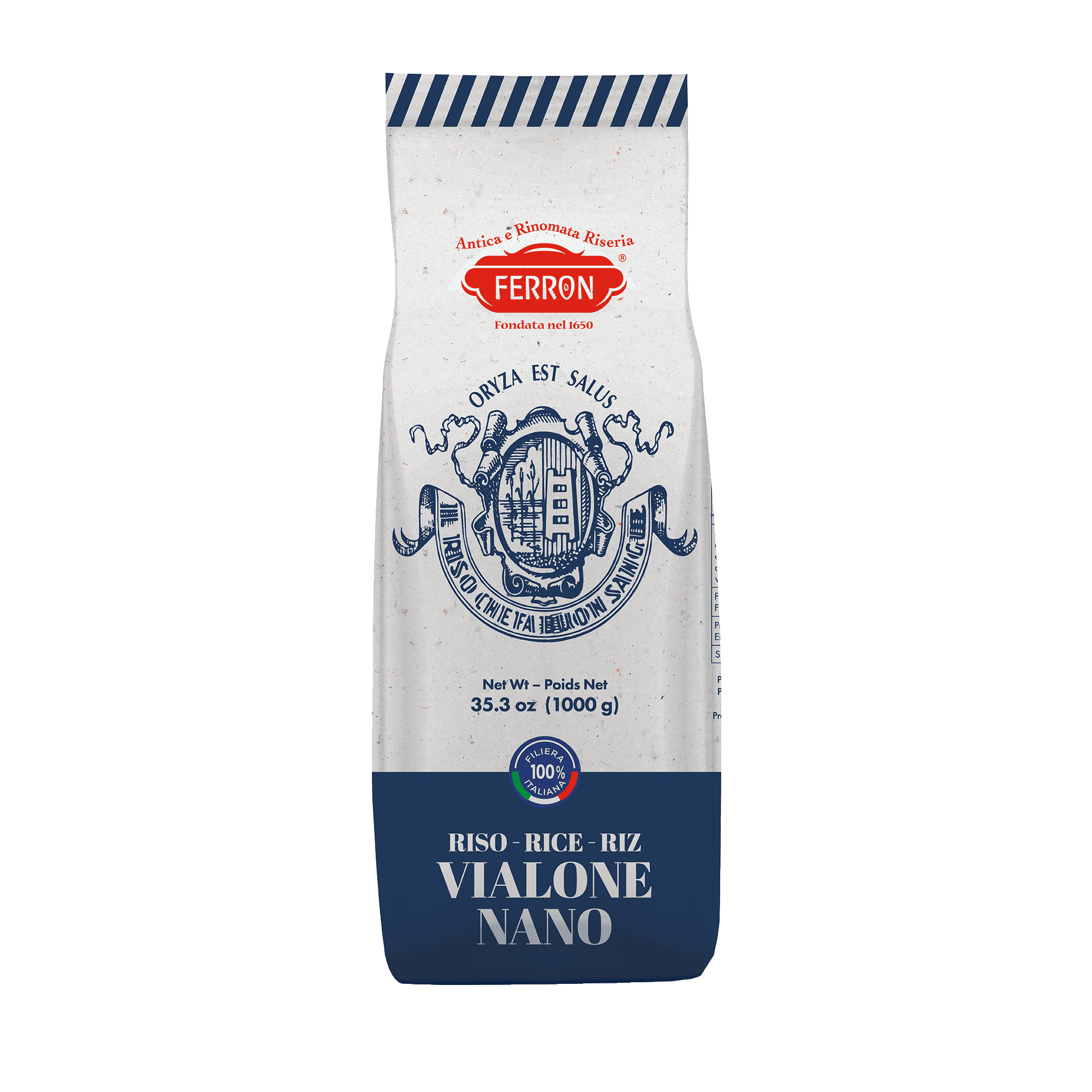 Vialone Nano is the preferred risotto rice of the Veneto region and has a unique culinary performance for risotto. The flavour is delicately herbaceous and clean. Cooking time is normally 14 to 15 minutes for ‘al dente’. Use this rice with meat and vegetable based risotto. Ferron rice is organic and grown without the use of pesticides or herbicides. In non-planting years, corn and medicinal herbs are cultivated to replenish the soil with essential nutrients. Water from pure and unpolluted underground springs encourages pristine crop growth. The rice paddies are home to carp fish, providing a natural pest control and delicate ecosystem where rice can flourish.