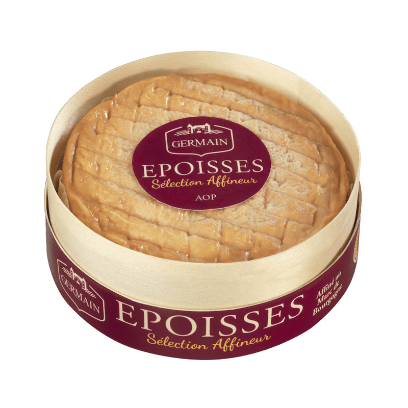 Epoisses is one of France’s most infamous cheeses. Made from pasteurized cow’s milk, it has a firm centre and an orange-reddish rind. The Germain Epoisses is fruity in flavour, with a strong aroma and rich, creamy interior. This handcrafted cheese is first washed in brine, then cured in humid cellars for four weeks. After this brief aging period, the rind is rinsed with Marc de Bourgogne, a liqueur that is a by-product of the local wine industry.
