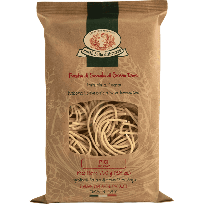 Similar to Spaghetti but wider, Pici represent one of the recent innovations of the Rustichella d’Abruzzo Regional Formats. The classic condiment with which they are accompanied is aglione, a tomato sauce combined with a particular type of garlic that is born and grows only in Sarteano (Siena) and surroundings, but can also be combined with a liver sauce or more simply alle criciole (crumbs of Tuscan bread fried in olive oil). We also recommend pairing with Porcini Mushroom Sauce.