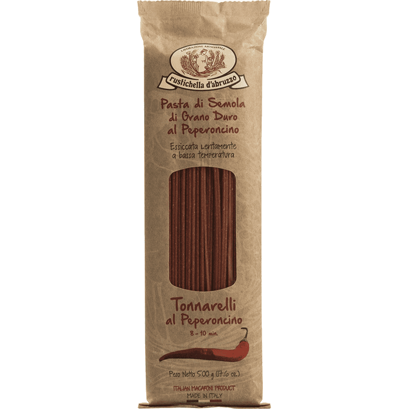 Format of artisan pasta flavored with red chili, similar to Spaghetti but with a larger diameter, it almost necessarily goes well with Rustichella d’Abruzzo Arrabbiata or Amatriciana sauce for lovers of intense flavors, or can be delicately seasoned with an Extra Virgin Olive Oil or a condiment of Anchovies and Chili in Extra Virgin Olive Oil, for the diehards of chili.